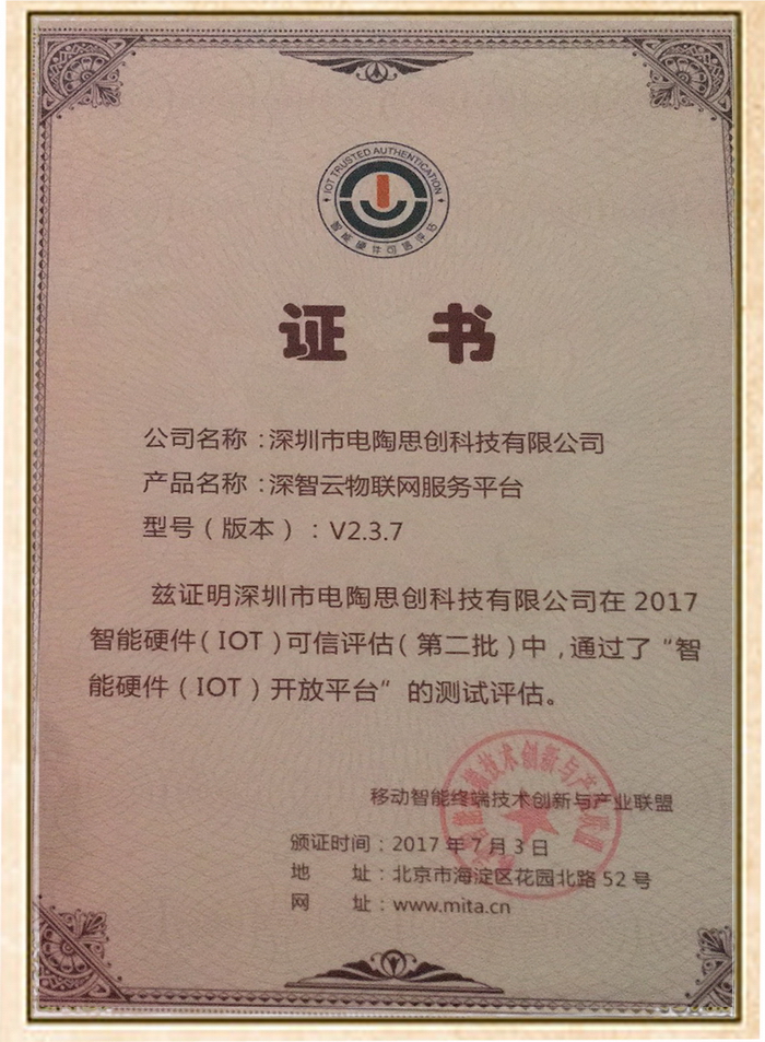 深智云凭借创新的深智云物联网服务平台,通过了“智能硬件(IoT)开放平台”认证测试,获工信部颁发可信云(IoT)认证。