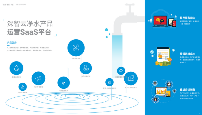 深智云通过智能交互硬件、智能产品软件、云服务、供应链产品、《深智视野》等不同维度的资源聚合平台,为净水厂商提供物联网净水行业资源共享服务,帮助企业在产品研发、渠道建设、市场推广等多方面提升品牌与产品的规划运营能力。