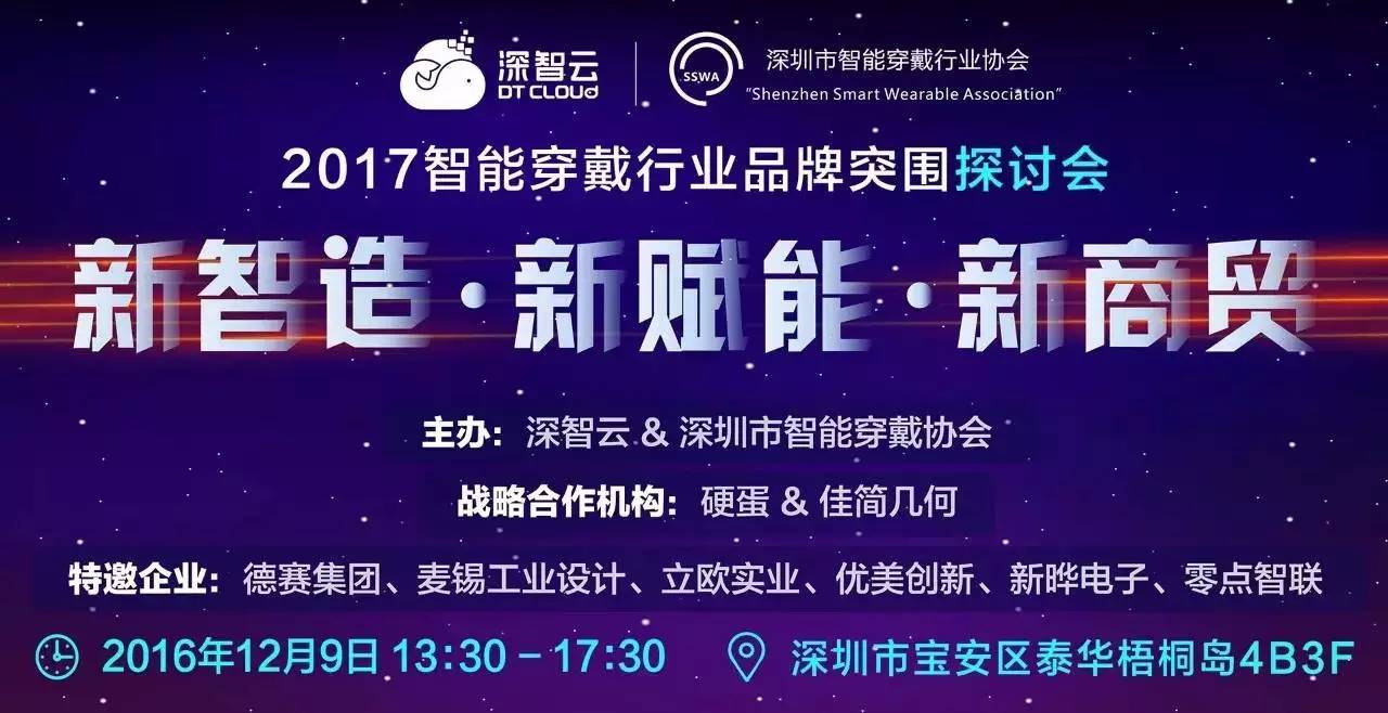 2016年12月9日,国内知名智能硬件云平台深智云将联手深圳市智能穿戴行业协会在深圳梧桐岛举办主题为“新智造·新赋能·新商贸”的智能穿戴行业品牌突围探讨会,会议聚焦智能穿戴行业全产业链,邀请从上游模块商、方案商到设计品牌、终端品牌在内的全行业品牌,共同探讨2017年智能穿戴行业的新风口。