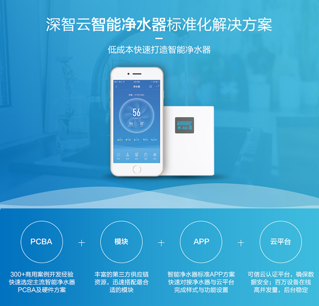 深智云智能净水器标准化解决方案,通过完整的“PCBA+模块+APP+云”产品模式,一站式标准化打造智能净水器,实现远程遥控、实时监控水质、监测滤芯状态、换芯提醒等智能化功能。