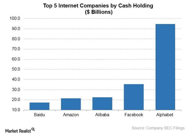 9月18日,据最新消息显示,截至今年第二季度末,谷歌母公司Alphabet是全球最“有钱”的互联网公司,Facebook排名第二,而中国的阿里巴巴位居第三,亚马逊与百度分列四、五名。前三名的现金和短期投资为分别为947、355和225亿美金。