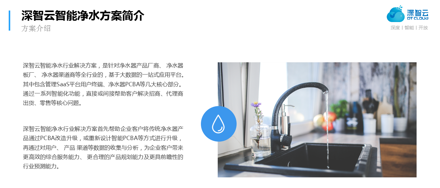 深智云着眼行业痛点,总结与多家净水厂商的合作经验,推出净水行业智能化解决方案,通过APP、SaaS管理平台,快速实现净水产品智能化;同时提供消费者管理、设备管理、代理/售后管理三大业务板块,精准解决客户痛点。在硬件方面,深智云通过与行业知名板厂合作,为用户一站式解决软硬件问题,迅速摆脱产品同质化、售后服务困难等问题,同时解决诸如校园、政府场景应用中的一些困境,全方位助力传统净水厂商在激烈的市场竞争突出重围。
