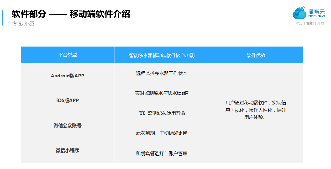 同时,针对具有不同产品与服务需求的净水厂商,深智云在APP软件端提供了安卓端、iOS端、微信公众号与微信小程序等多种移动端的APP开发接入服务,为客户提供专业、全面的接入服务,充分提升用户体验。