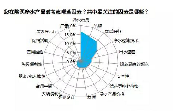 中国商报研究院发布的《2017中国净水行业调研报告》显示,消费者在购买净水器时主要考虑的因素占比主要为:24.71% 的人看重价格, 65.25% 的人看重质量,52.04% 的消费者看重外观,58.37% 的消费者考虑服务,24.16% 的消费者考虑品牌。报告还显示,目前消费者认为净水行业突出的问题有两个:品牌净水器消费者认为价格偏高;消费者对多个品牌售后服务不满意,认为服务人员态度差。